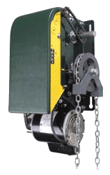 Opérateur à usage intensif destiné à des portes sectionnelles à élévation et surélévation verticale, ou des portes et grilles à enroulement. Il s'installe des deux côtés de la porte sur mur ou sur capot. Il intègre un palan à chaîne à engagement automatique pour actionner manuellement la porte.