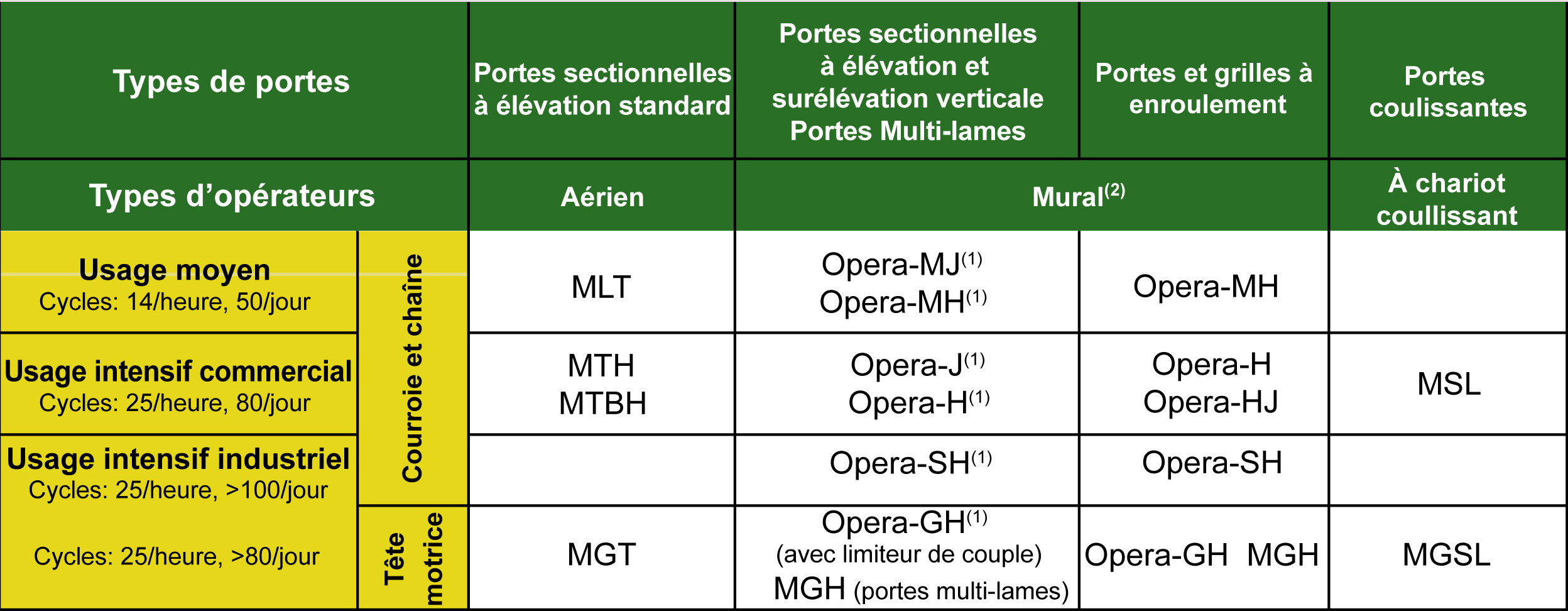 Les opérateurs de type aérien sont conçus pour ouvrir et fermer des portes sectionnelles à élévation standard, grâce au va-et-vient du chariot sur les rails. Ils sont généralement installés au centre de la porte en position horizontale. Ils nécessitent un espace entre le point le plus élevé de la porte et le plafond, ainsi qu'un espace à l'arrière de la porte lorsque celle-ci est ouverte.