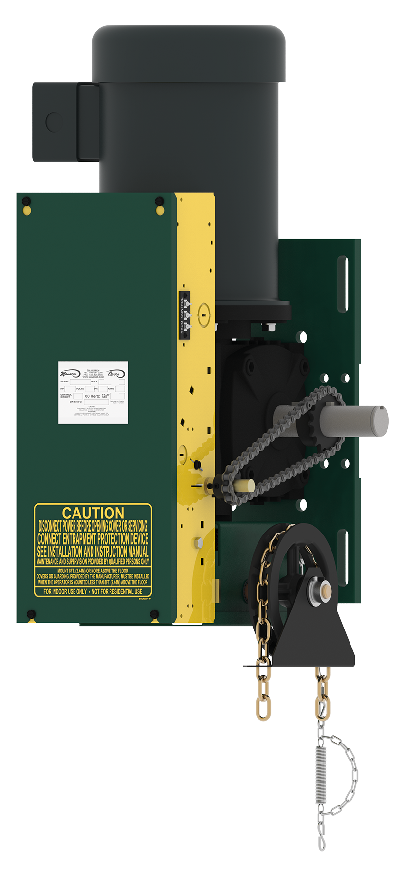 The operator can be wall or hood mounted on either side of the door and incorporates a solenoid brake and a chain hoist for manual operation with a floor level engaging device with electrical cut-out.